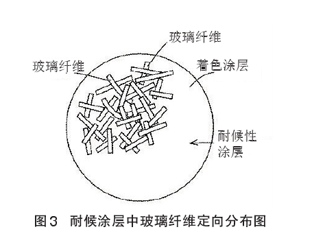 該高耐候性彩色水泥瓦制作流程是將以水泥為主要成分的坯料擠壓成坯,瓦體養(yǎng)護(hù)硬化,涂以涂料,修平整,形成底層涂膜層。為了防止瓦中堿分對(duì)上層涂膜層的侵蝕,可在底涂膜層上,涂以耐堿性涂料,形成耐堿涂膜層,然后涂以著色涂料,形成裝飾涂膜層,最后涂以耐候涂料,形成耐候涂膜層(見圖1和圖2)。著色涂層由含有所需著色顏料的水性丙烯酸涂料構(gòu)成,其厚度約為100μm。耐候性涂層由與著色層相同的水性丙烯酸涂料與耐候性纖維(添加量為7%~12%)組成的涂料構(gòu)成,其厚度約為 25μm。耐候性涂料用噴槍高壓噴涂在瓦著色裝飾涂層上。耐候性涂料涂覆在著色涂層上時(shí),玻璃纖維以平躺姿態(tài),水平方向無序隨機(jī)定向分布(見圖 3)。對(duì)瓦涂以耐候性涂料后,為了固定玻璃纖維,約在100℃下充分干燥。